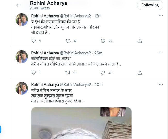 लालू यादव की दूसरी बेटी रोहिणी ने मंगलवार की सुबह अपने पिता की तस्वीर साझा करते हुए ट्विटर पर लिखा कि गरीब और वंचित के खिलाफ हो रहे जुल्म के विरोध में आवाज उठती रहेगी। यह ट्वीट लालू को दोषी करार दिए जाने से पहले का है। पिता को दोषी करार दिए जाने के साथ ही उनकी भाषा बदल गई। उन्होंने न्यायपालिका की भूमिका पर ही सवाल खड़े करने शुरू कर दिए और एक के बाद एक कई ट्वीट करती गईं। इस कड़ी में वे न्यायपालिका की मर्यादा का सम्मान करना भी भूल गईं।